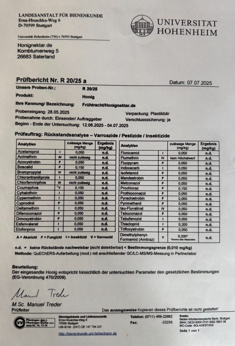 Wie jedes Jahr haben wir unseren Honig untersuchen und zertifizieren lassen. Es wurden keine Rückstände wie Varroazide / Pestizide / Insektizide festgestellt! Worauf wir sehr stolz sind!!!
